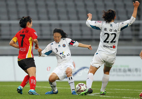 7일 오후 고양종합운동장에서 열린 2010 여자프로축구 서울시청과 고양대교의 경기. 서울시청 문슬아가 슛을 날리고 있다.