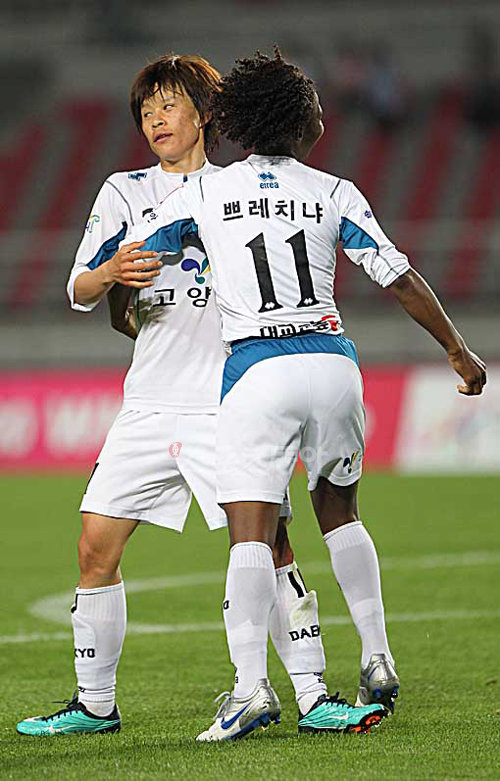 7일 오후 고양종합운동장에서 열린 2010 여자프로축구 서울시청과 고양대교의 경기. 고양대교 강선미가 골을 터트린 후 동료와 기뻐하고 있다.