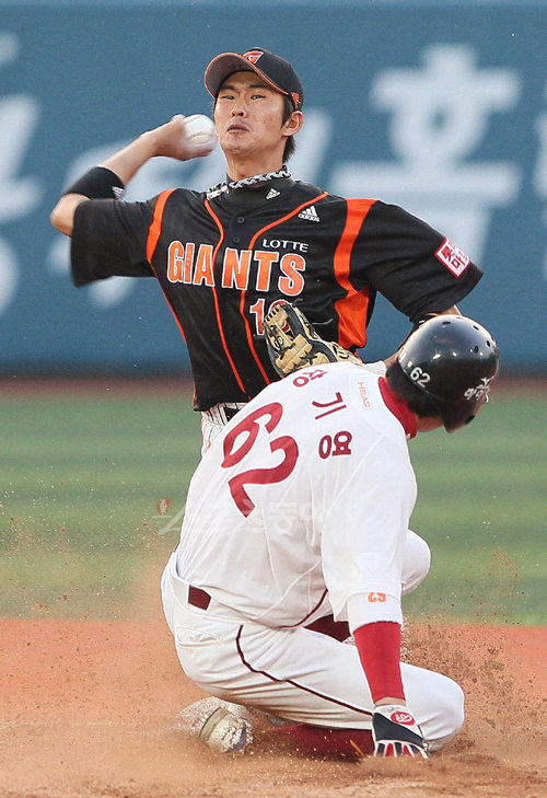 8일 목동야구장에서 열린 2010 프로야구 넥센과 롯데의 경기에서 3회말 1사 1루 황재균의 유격수 땅볼에 1루주자 장기영이 2루에 세이프 되고 있다.