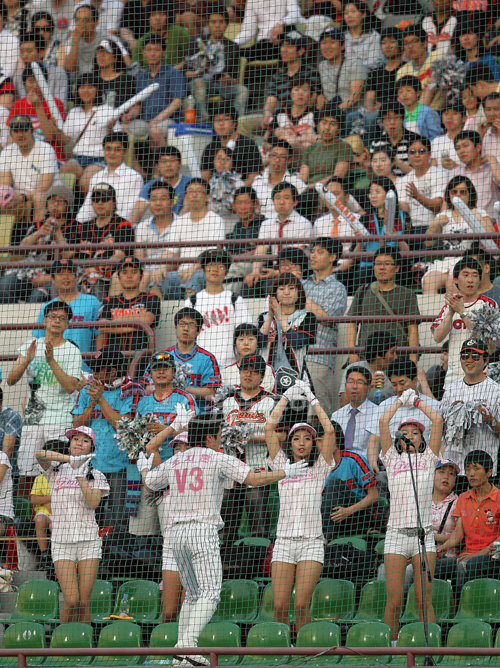 2010 프로야구 롯데 대 넥센 경기가 8일 목동 야구장에서 열렸다. 롯데 치어리더와 팬들이 응원을 하고 있다.
