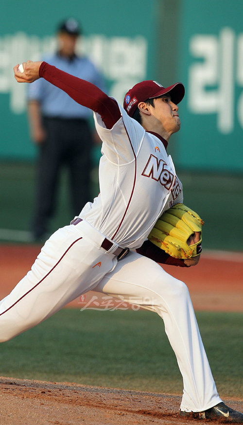 2010 프로야구 넥센 대 롯데 경기가 9일 목동 야구장에서 열렸다. 선발투수로 등판한 넥센 배힘찬이 역투하고 있다.