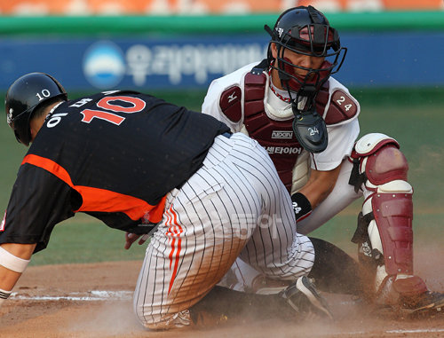 2010 프로야구 넥센 대 롯데 경기가 9일 목동 야구장에서 열렸다. 1회초 2사 1, 2루에서 강민호의 안타때 이대호가 홈을 파고들다 태그아웃되고 있다.