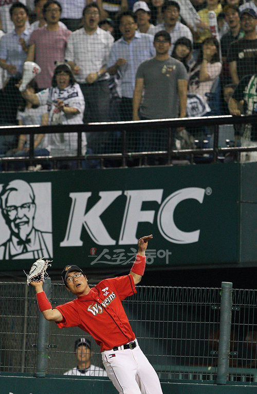 11일 오후 잠실 야구장에서 열린 프로야구 두산-SK 경기. 8회말 SK박정권이 김동주의 파울타구를 잡아내고 있다.
