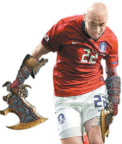 그리스전에서 오른쪽 수비수로 맹활약한 차두리를 두고 누리꾼들은 합성사진과 만화를 통해 ‘차두리 로봇설’ 등을 퍼뜨리며 반기고 있다. 사진은 차두리를 전사의 모습으로 합성한 것으로 한 누리꾼이 만들었다. 사진 출처 닉네임 ‘럭키2인자’ 블로그