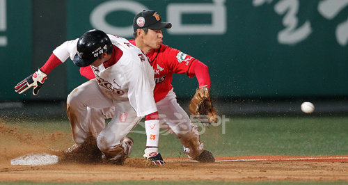 15일 오후 목동야구장에서 열린 2010 프로야구 넥센 히어로즈와 SK 와이번스의 경기에서 경기에서 5회말 넥센 공격, 1사 주자 2루 상황, 2루주자 장기영이 3루로 진루하고 있다.