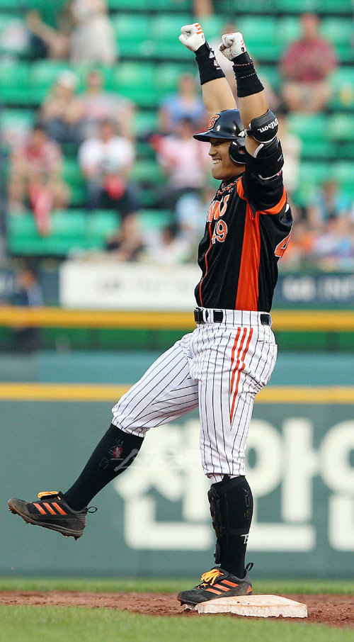 20일 오후 서울 잠실야구장에서 열린 2010 프로야구 LG트윈스와 롯데 자이언츠의 경기에서 7회초 롯데 공격, 1사 주자 1루 홍성흔이 1타점 2루타를 친 후 두 손을 번쩍 들며 환호하고 있다.