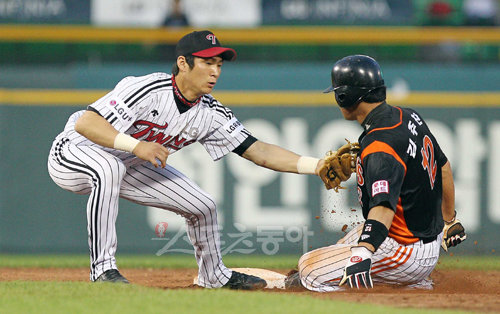 20일 오후 서울 잠실야구장에서 열린 2010 프로야구 LG트윈스와 롯데 자이언츠의 경기에서 8회초 롯데 공격 2사 1루 롯데 김주찬이 손아섭의 타석 때 도루를 시도 했으나 아웃되고 있다.