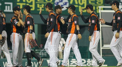 20일 오후 잠실야구장에서 열린 2010 프로야구 LG 트윈스와 롯데 자이언츠의 경기에서 롯데가 10대5로 승리했다. 선수들이 승리의 기쁨을 나누고 있다.
