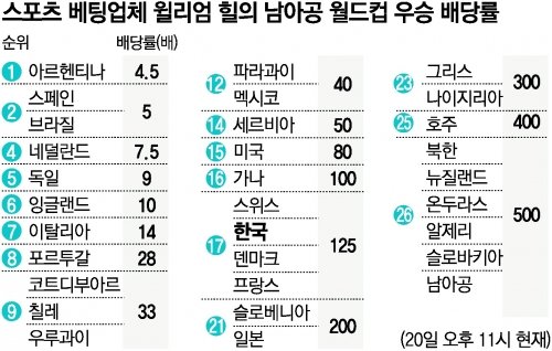 한국의 우승 확률도 대회가 시작되기 전보다 높아졌다. 예상보다 선전하고 있다는 뜻이다. 대회를 시작하기 전 대부분의 온라인 도박업체는 한국의 우승 배당률을 1 대 200 정도로 예상했다. 하지만 한국이 첫 경기인 그리스를 이기자 레드브록스는 한국의 우승 배당률을 1 대 150으로 낮췄다. 나이지리아는 1 대 350, 그리스는 1 대 500이다. 북한은 1 대 2000. 아르헨티나는 2차전에서 한국을 4-1로 꺾자 우승 확률 1위에 올랐다.