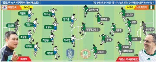 나이지리아는 23명 전원이 해외파로 구성돼 있다. 조셉 요보와 야쿠부(이상 에버턴), 마르틴스(볼프스부르크) 등 핵심선수 상당수가 유럽 빅 리그에서 뛰고 있다. 그러나 두려워할 필요는 없다. 한국도 박지성(맨유)과 이청용(볼턴), 차두리(프라이부르크), 박주영(AS 모나코) 등이 있다. 오히려 조직력 면에서는 한국이 우세하다. 3월 지휘봉을 잡은 나이지리아 라예르베크 감독은 이름 값 위주로만 최종 엔트리를 꾸려 조직력에 문제가 있다는 평을 듣고 있다. 반면 한국은 허 감독이 취임 후 수 십 차례 시험을 거치며 뽑은 최정예 멤버로 국내파와 해외파가 이상적인 조합을 이루고 있다.