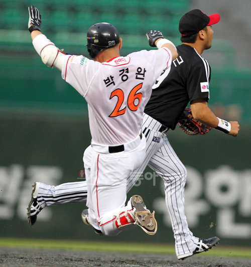 22일 오후 인천 문학야구장에서 2010 프로야구 SK 와이번스와 LG 트윈스 경기에서 3회말 SK 공격, SK 박경완이 1사 1, 3루 상황에서 우중간 2루타를 친 후 2루를 밟기 위해 뛰고 있다.