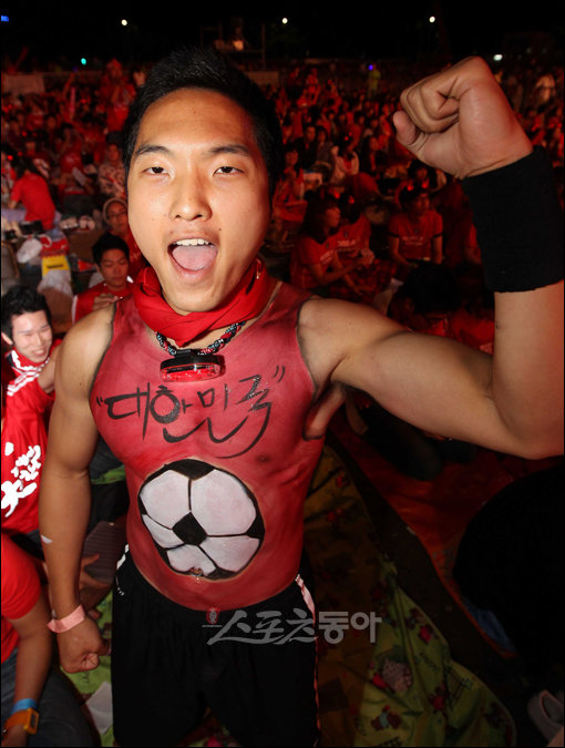 2010 남아공월드컵 16강 진출을 위한 본선 B조 마지막 경기인 나이지리아전을 앞둔 태극전사들의 선전을 응원하기 위해 23일 새벽에 서울시청광장을 가득 메운 시민들이 응원전을 펼치고 있다.
