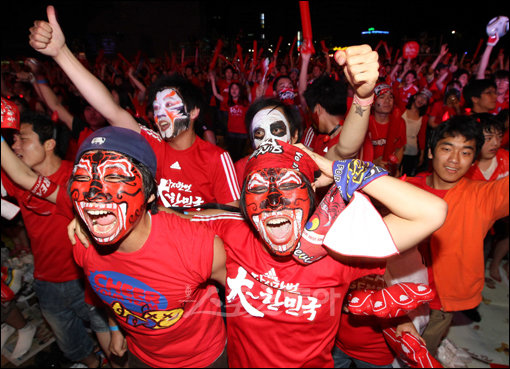 2010 남아공월드컵 16강 진출을 위한 본선 B조 마지막 경기인 나이지리아전을 앞둔 태극전사들의 선전을 응원하기 위해 23일 새벽에 서울시청광장을 가득 메운 시민들이 응원전을 펼치고 있다.