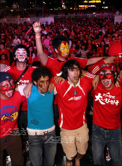 2010 남아공월드컵 16강 진출을 위한 본선 B조 마지막 경기인 나이지리아전을 앞둔 태극전사들의 선전을 응원하기 위해 23일 새벽에 서울시청광장을 가득 메운 시민들이 응원전을 펼치고 있다.