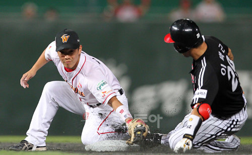 23일 오후 인천 문학야구장에서 열린 2010 프로야구 SK 와이번스와 LG 트윈스 경기에서 7회초 LG 공격 1사 무주자 상황에서 이택근이 안타를 친 후 2루까지 진루하고 있다.