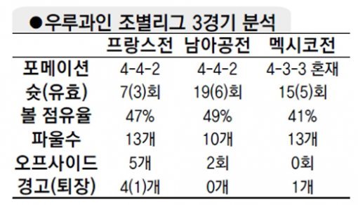 국제축구연맹(FIFA)이 내놓은 자료에 따르면 우루과이는 프랑스와 1차전과 남아공과 2차전에서 4-4-2 포메이션을 가동했다.