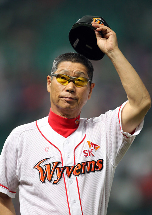 24일 오후 인천 문학야구장에서 열린 2010 프로야구 SK 와이번스와 LG 트윈스 경기에서 9 대 2로 승리한 SK 김성근 감독이 관중에게 인사를 하고 있다.