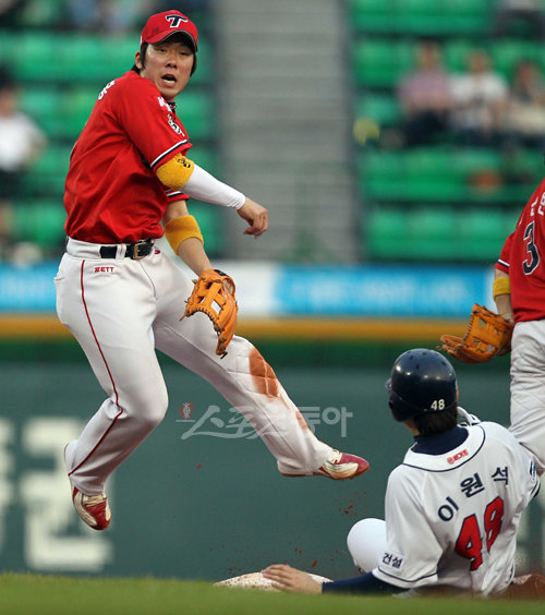 25일 오후 서울 잠실야구장에서 열린 2010 프로야구 두산 베어스와 KIA 타이거즈 경기에서 2회말 두산 공격 무사 1루 상황에서 두산 이원석이 이종욱의 땅볼 때 포스아웃되고 있다.