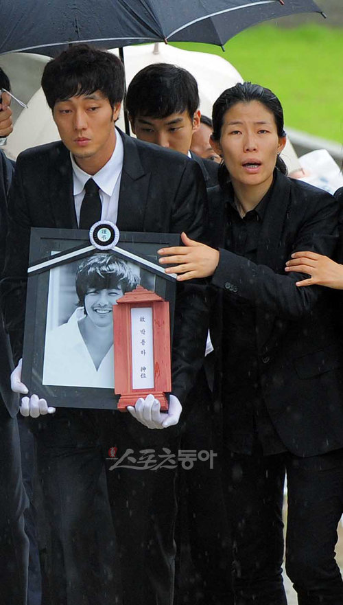 2일 오전 경기도 성남시 분당 메모리얼 파크에서 故 박용하의 납골식이 열린 가운데 배우 소지섭이 고인의 영정을 들고 영원한 안식처인 장지로 향하고 있다.