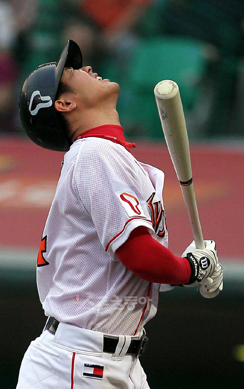 6일 저녁 인천 문학야구장에서 2010 프로야구 SK 와이번스와 삼성 경기가 열렸다. 2회말 SK 공격 1사상황에서 최정이 몸에 볼을 맞고 고통스러워 하고 있다.
