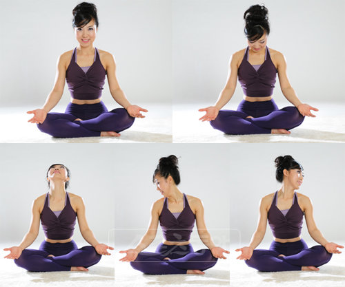5. 숨을 들이마시며 원위치하고 호흡을 내쉬며 오른쪽 어깨를 바라본다. 10초 정지.