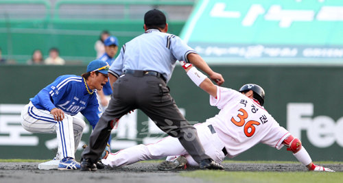 7일 문학야구장에서 열린 2010 프로야구 SK와 삼성의 경기에서 2회말 선두 박정권이 우전안타를 때려내고 오버런해 2루에서 아웃되고 있다. 삼성 유격수 김상수.