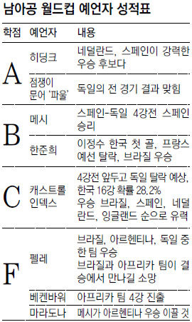 여느 월드컵과 마찬가지로 낙제점을 면하지 못한 예언가는 ‘축구 황제’ 펠레다. “브라질이 가장 강력한 우승 후보다. 아프리카 팀과의 결승전을 보고 싶다”던 그의 예언은 저주가 됐다. 16강전을 앞두고 우승 후보로 지목한 브라질, 아르헨티나, 독일은 쓴잔을 마셨다. 독일의 축구 영웅 프란츠 베켄바워는 “아프리카 팀이 4강에 오를 것”이라며 펠레의 예언을 거들다 망신살이 뻗쳤다.