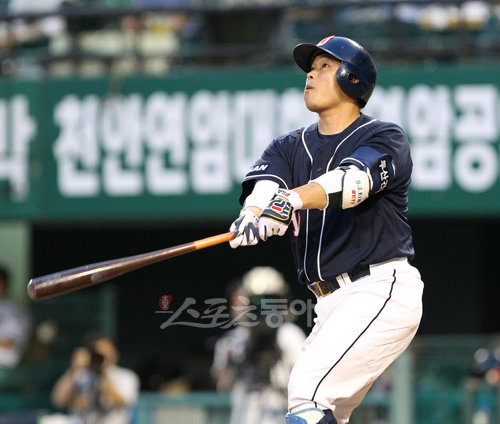 9일 문학야구장에서 열린 2010 프로야구 두산와 LG 경기에서 4회초 2사 1루 상황에 김동주가 투런홈런을 때려내고 있다.