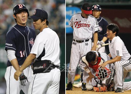 9일 문학야구장에서 열린 2010 프로야구 두산와 LG 경기에서 6회초 무사 1루 상황에 고영민이 심수창에게 빈볼을 맞고 고통을 호소하고 있다(왼쪽), 6회초 무사 1, 2루 김현수 타석때 심수창의 폭투로 몸에 볼을 맞은 투수 조인성이 고통을 호소하고 있다.