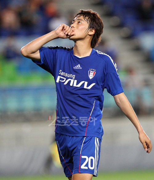 21일 수원월드컵경기장에서 열린 2010 하나은행 FA 컵 16강 수원삼성과 수원시청의 후반 경기에서 연이어 두 골을 뽑아낸 백지훈이 세리머니를 하고 있다.