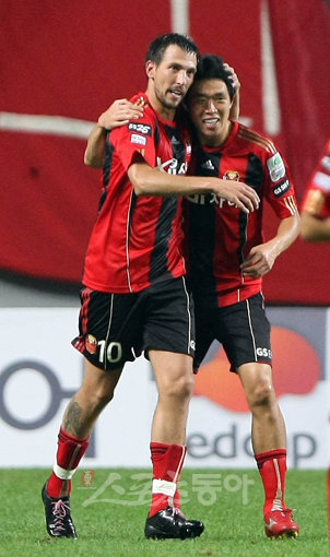 FC서울 데얀(왼쪽)이 수원 삼성전에서 후반 선제골을 넣은 뒤 동료와 함께 기뻐하고 있다.