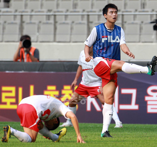 ‘FC바르셀로나 초청 K리그 올스타전 2010’을 하루 앞둔 3일 오후 서울월드컵경기장에서 K리그 올스타 공식훈련이 열렸다. 올스타 이동국이 몸을 풀고 있다.