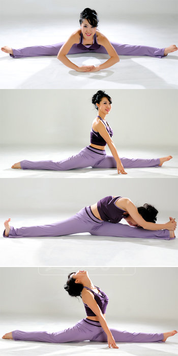 1. 양 옆으로 다리를 벌리고 앉아서 호흡을 내쉬며 상체를 숙인다. 10초 정지 3회 반복
