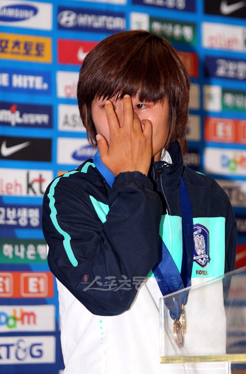 2010 FIFA U-20 여자월드컵에서 꿈의 4강 신화를 이룬 ‘한국 여자 축구국가대표팀이 4일 오후 오후 인천국제공항을 통해 입국했다. 지소연이 기자회견 중 어머니에게 감사한 마음을 전하며 울음을 터뜨리고 있다.
