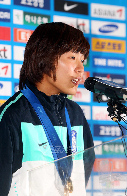 2010 FIFA U-20 여자월드컵에서 꿈의 4강 신화를 이룬 ‘한국 여자 축구국가대표팀이 4일 오후 오후 인천국제공항을 통해 입국했다. 지소연이 기자회견 중 어머니에게 감사한 마음을 전하고 있다.