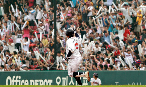 4일 서울 잠실야구장에서 열린 2010 프로야구 두산과 롯데의 경기에서 1회말 1사 2, 3루 상황에 두산 최준석이 3점포를 때려내고 그라운드를 돌고 있다.