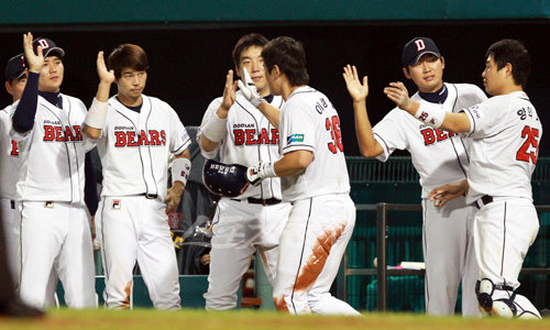 4일 서울 잠실야구장에서 열린 2010 프로야구 두산과 롯데의 경기에서 6회말 1사 1, 2루 상황에 이성열이 3점포를 쏘아올리고 덕아웃에 들어와 동료들의 뜨거운 환영을 받고 있다.