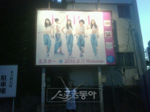 카라는 11일 싱글 음반 ‘미스터’를 발표하고 일본진출에 나선다. 이를 위해 카라는 지난달 말 일본으로 출국해 현지 방송에 출연하며 홍보에 나서고 있다. 전광판과 현수막 사진은 ‘미스터’ 프로모션의 일환.