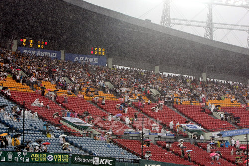 5일 서울 잠실야구장에서 열린 2010 프로야구 두산과 롯데의 경기에서 3회초 갑자기 쏟아진 폭우로 경기가 잠시 중단 됐다. 많은 관중들이 경기장 상단관중석에서 비를 피하고 있다.