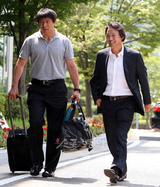 축구 국가대표팀의 새 사령탑 조광래 감독이 이끄는 축구대표팀이 오늘 11일 저녁 수원월드컵경기장에서 열리는 나이지리아와의 친선경기를 앞두고 9일 오후 파주NFC에 소집된 가운데 조광래 감독이 김현태 코치와 함께 훈련장으로 들어서고 있다.