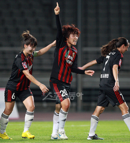 9일 경기도 고양종합운동장에서 열린 WK리그 2010 수원FMC와 서울시청의 후반 경기 인저리 타임에서 역전골을 성공시킨 수원 FMC의 허 빈(가운데)이 세리머니하고 있다.