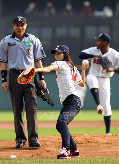 15일 서울 잠실야구장에서 열린 2010 프로야구 두산과 SK의 경기에 앞서 ‘김수로’에서 열연을 펼치고 있는 탤런트 서지혜가 시구를 하고 있다.
