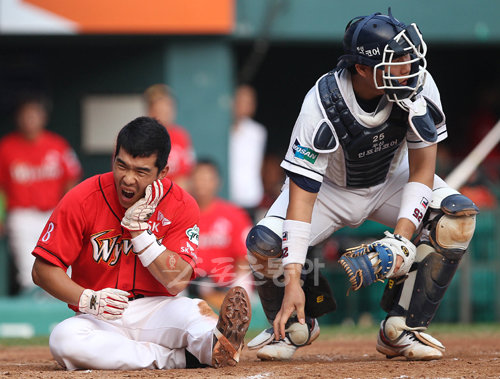 15일 서울 잠실야구장에서 열린 2010 프로야구 두산과 SK의 경기에서 3회초 2사 3루 상황에 박재상의 희생플라이에 홈으로 쇄도하던 정근우가 세이프된 후 포수 양의지와 충돌해 뺨이 아픈듯 만지고 있다.