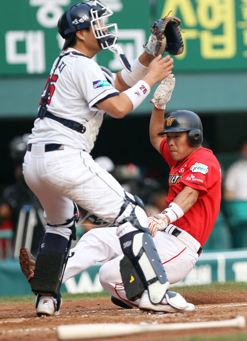 15일 서울 잠실야구장에서 열린 2010 프로야구 두산과 SK의 경기에서 3회초 2사 3루 상황에 박재상의 희생플라이에 홈으로 쇄도하던 정근우가 세이프되고 있다.
