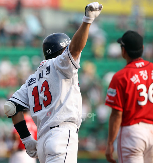 15일 서울 잠실야구장에서 열린 2010 프로야구 두산과 SK의 경기에서 1회말 1사 2, 3루 상황에 손시헌이 쓰리런 홈런을 날리고 그라운드를 돌고 있다.