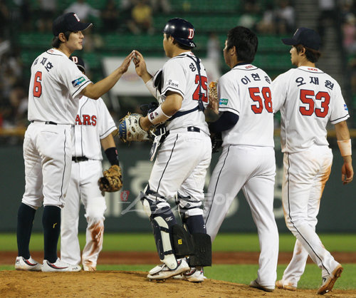 15일 서울 잠실야구장에서 열린 2010 프로야구 두산과 SK의 경기에서 9대 5로 승리한 두산 선수들이 경기가 끝낮 마운드에 올라 자축하고 있다.