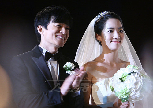 5월 결혼한 ‘새신랑’ 이범수는 아내 이윤진씨(오른쪽)가 드라마 촬영의 고달픔을 잊게 해주는 피로회복제라며 행복한 미소를 지었다. 사진은 5월22일 두 사람의 결혼식 장면.