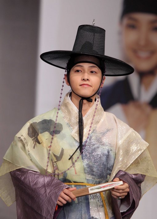 17일 오후 서울 광진구 광장동 워커힐호텔 비스타홀에서 KBS 월화드라마 '성균관 스캔들(극복 김태희, 연출 김원석)' 제작 발표회가 열렸다. 탤런트 송중기가 한복 패션쇼를 펼치고 있다.
