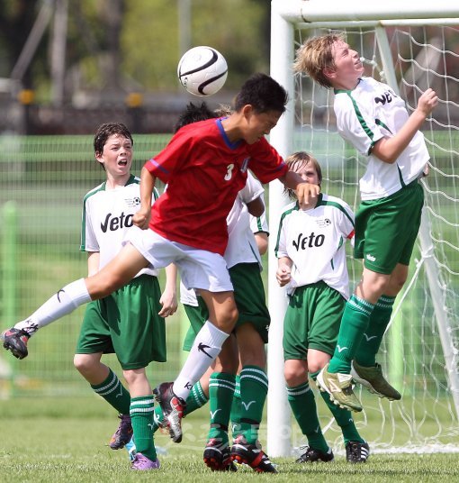 18일 경북 경주시 구황동 알천2구장에서 열린 ‘2010 경주 국제 유소년(U-12) 축구 페스티벌’한국 충무팀과 호주 사우스 호바트팀의 경기에서 공중볼을 다투는 양팀선수들의 모습이 재미있다.