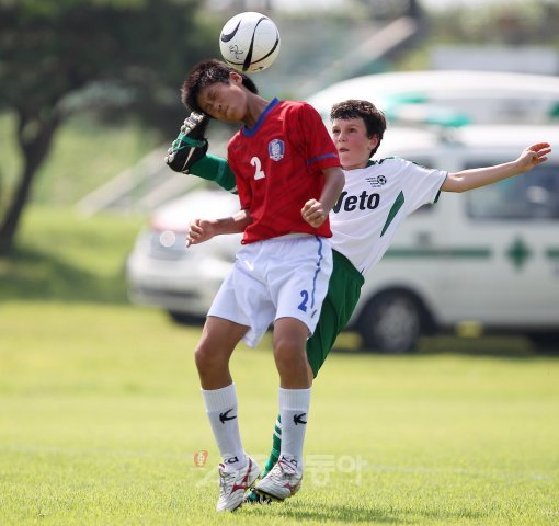 18일 경북 경주시 구황동 알천2구장에서 열린 ‘2010 경주 국제 유소년(U-12) 축구 페스티벌’한국 충무팀과 호주 사우스 호바트팀의 경기에서 한국 심성호와 호주 매튜 페이스가 볼을 다투고 있다.